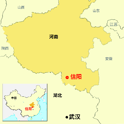 信阳属于第三线城市,人口有约七百万。信阳位于湖北省与河南省之间的边境。虽然信阳位于河南省的最南部,跟河南省的北部城市对比,信阳的文化与地理位置比较接近武汉。信阳远离武汉只有200公里,乘搭高速火车从武汉到信阳只需40分钟。如果从信阳到郑州(河南省的首都),乘搭高速火车需要1.5小时。